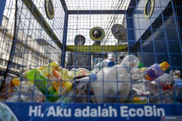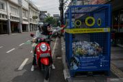 Warga membuang sampah plastik ke dalam 'Eco Bin' di Jalan Braga, Bandung, Jawa Barat, Kamis (11/5/2023). River Clean Up Indonesia memasang 'Eco Bin' di beberapa ruang publik di Kota Bandung guna menghindari terjadinya pembuangan sampah plastik ke sungai serta mengedukasi masyarakat sekitar untuk pemilahan sampah plastik dan organik. ANTARA FOTO/Raisan Al Farisi/foc.