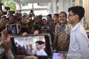 Bupati Pangandaran Jeje Wiradinata (kanan) menyambut kedatangan Aparatur Sipil Negara (ASN) tenaga Guru Husein Ali Rafsanjani (kiri) saat pertemuan tertutup di Pendopo Kabupaten Pangandaran, Jawa Barat, Kamis (11/5/2023). Setelah pertemuan tersebut, Husein menyatakan batal mundur dan akan tetap mengajar di Bandung atau tetap di Pangandaran, setelah sebelumnya ia mengajukan pengunduran diri dari ASN Pemkab Pangandaran karena tidak mau mencabut laporan dugaan praktik pungutan liar (Pungli) saat Latihan Dasar (Latsar) pada tahun 2020. ANTARA FOTO/Adeng Bustomi/aww.
