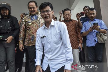 Bupati Pangandaran Jeje Wiradinata (kedua kiri) dan Aparatur Sipil Negara (ASN) tenaga Guru Husein Ali Rafsanjani (tengah) berjalan usai pertemuan tertutup di Pendopo Kabupaten Pangandaran, Jawa Barat, Kamis (11/5/2023). Setelah pertemuan tersebut, Husein menyatakan batal mundur dan akan tetap mengajar di Bandung atau tetap di Pangandaran, setelah sebelumnya ia mengajukan pengunduran diri dari ASN Pemkab Pangandaran karena tidak mau mencabut laporan dugaan praktik pungutan liar (Pungli) saat Latihan Dasar (Latsar) pada tahun 2020. ANTARA FOTO/Adeng Bustomi/aww.