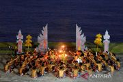 Sejumlah penari menampilkan Tari Kecak di Pantai Gunung Payung, Badung, Bali, Minggu (14/5/2023). Pengelola kawasan wisata tersebut menampilkan pertunjukan Tari Kecak dan api sebagai atraksi wisata baru untuk meningkatkan kunjungan wisatawan ke Pantai Gunung Payung. ANTARA FOTO/Fikri Yusuf/nym.