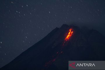 Lava pijar meluncur dari kubah lava Gunung Merapi terlihat dari Turi, Sleman, DI Yogyakarta, Kamis (18/5/2023). Menurut data BPPTKG periode pengamatan 17 Mei 2023 pukul 00.00-24.00 WIB telah terjadi 30 kali guguran lava pijar dengan jarak luncur maksimal 1.800 meter ke arah barat daya (kali Bebeng). ANTARA FOTO/Hendra Nurdiyansyah/aww.