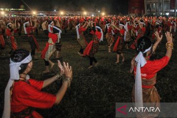 Sejumlah penari menampilkan tarian Dadas dan Bawo Dayak Kalimantan Tengah saat pencatatan Museum Rekor Dunia Indonesia (MURI) dalam pembukaan Festival Budaya Isen Mulang di lapangan GOR Serbaguna, Palangka Raya, Kalimantan Tengah, Senin (22/5/2023). Tari Dadas dan Bawo khas Dayak Kalteng yang dimainkan oleh 600 penari putra dan putri pilihan dari sanggar tari se-Kalteng tersebut berhasil memecahkan rekor MURI kategori jumlah peserta terbanyak. ANTARA FOTO/Makna Zaezar/nym.