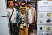 Calon haji Harun bin Senar (tengah) dibantu petugas memasuki Asrama Haji Embarkasi Surabaya (AHES), Surabaya, Jawa Timur, Rabu (24/5/2023). Harun bin Senar asal Kecamatan Proppo, Pamekasan, Madura tersebut menjadi calon haji tertua di Indonesia dengan umur 119 tahun yang akan berangkat ke Tanah Suci tahun 2023. ANTARA FOTO/Rizal Hanafi/tom.