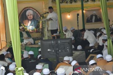 Ketua Umum Partai Gerindra Prabowo Subianto (tengah) menyampaikan sambutan menghadiri kegiatan Majelis Rasulullah di Pancoran, Jakarta Selatan Minggu (28/5/2023). Pada kegiatan tersebut Prabowo bersilaturahmi dengan jamaah Majelis Rasulullah dan mengikuti Haul Akbar ke-10 Sulthonul Qulub Alhabib Munzir Almusawa. ANTARA FOTO/Fakhri Hermansyah/tom.