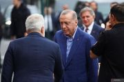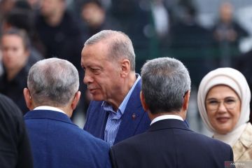 Presiden Turki Tayyip Erdogan bersiap untuk memberikan suaranya, di luar tempat pemungutan suara saat putaran kedua pemilihan presiden di Istanbul, Turki, Sabtu (28/5/2023). ANTARA FOTO/Reuters-Hannah McKa/hp.