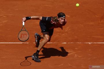 Petenis unggulan kelima asal Yunani Stefanos Tsitsipas mengembalikan bola ke arah lawannya petenis peringkat 445 asal Republik Ceko Jiri Vesely dalam laga putaran pertama Turnamen Tenis French Open, di Roland Garros, Paris, Prancis, Minggu (28/5/2023). Tsitsipas mengalahkan Jiri Vesely membutuhkan waktu tiga jam lebih 3-1 (7-5, 6-3, 4-6, 7(9)-6(7). ANTARA FOTO/Reuters-Kai Pfaffenbach/hp.