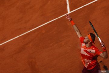 Petenis peringkat 445 asal Republik Ceko Jiri Vesely melakukan service bola ke arah lawannya petenis unggulan kelima asal Yunani Stefanos Tsitsipas dalam laga putaran pertama Turnamen Tenis French Open, di Roland Garros, Paris, Prancis, Minggu (28/5/2023). Tsitsipas mengalahkan Jiri Vesely membutuhkan waktu tiga jam lebih 3-1 (7-5, 6-3, 4-6, 7(9)-6(7). ANTARA FOTO/Reuters-Kai Pfaffenbach/hp.
