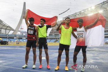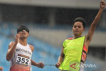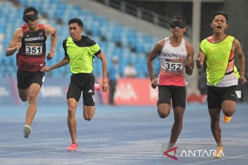 Pelari putra Indonesia Muhammad Dimas Ubaidillah (kiri) dan Ruli Al Kahfi Mubaroq (kedua kanan) beradu cepat pada final lari 100 meter T11 ASEAN Para Games 2023 di Morodok Techo National Stadium, Phnom Penh, Kamboja, Senin (5/6/2023). Ruli Al Kahfi Mubaroq berhasil meraih emas dengan catatan waktu 11,44 detik disusul rekan senegaranya Muhammad Dimas Ubaidillah yang memperoleh medali perunggu dengan catatan waktu 11,8 detik. ANTARA FOTO/Zabur Karuru/tom.