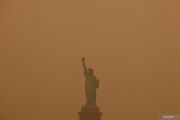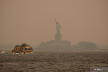 Patung Liberty diselimuti kabut dan asap akibat kebakaran hutan di Kanada, di New York, Amerika Serikat, Selasa (6/6/2023). ANTARA FOTO//Amr Alfiky/hp.