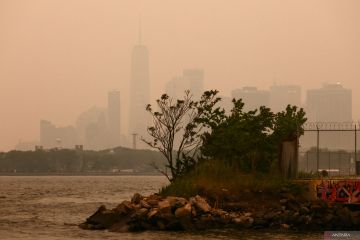 Cakrawala Manhattan terlihat tertutup kabut dan asap akibat kebakaran hutan di Kanada, di New York, Amerika Serikat, Selasa (6/6/2023). ANTARA FOTO//Amr Alfiky/hp.