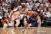 Pebasket Miami Heat Jimmy Butler berebut bola dengan pebasket Denver Nuggets Jamal Murray pada gim ketiga Final NBA 2023 di Miami, Florida, Amerika Serikat, Rabu (7/6/2023). Kemenangan atas Miami Heat membuat skor menjadi 2-1 untuk keunggulan Jokic dan kawan-kawan. ANTARA FOTO/Kyle Terada-USA TODAY Sports/rwa.