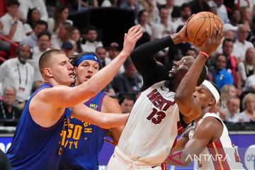 Pebasket Miami Heat Bam Adebayo berusaha menembakkan bola yang dihalangi pebasket Denver Nuggets Nikola Jokic pada gim ketiga Final NBA 2023 di Miami, Florida, Amerika Serikat, Rabu (7/6/2023). Kemenangan atas Miami Heat membuat skor menjadi 2-1 untuk keunggulan Jokic dan kawan-kawan. ANTARA FOTO/Kyle Terada-USA TODAY Sports/rwa.