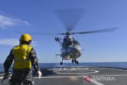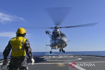 Helikopter Dauphin AS 365N3+ TNI AL mendarat di geladak KRI I Gusti Ngurah Rai-332 dalam fase laut Multilateral Naval Exercise Komodo (MNEK) 2023 di Selat Makassar, Sulawesi Selatan, Kamis (8/6/2023). Dalam fase laut tersebut berlangsung latihan penyelamatan, operasi interdiksi maritim, manuvra taktis, bantuan kemanusiaan dan penanggulangan bencana alam, dan penghormatan terakhir kepada 17 kapal perang Angkatan Laut negara yang terlibat dalam MNEK 2023. ANTARA FOTO/M Risyal Hidayat/tom.