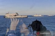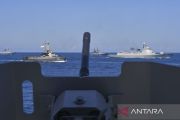 Kapal perang Angkatan Laut China Zhanjiang 165 (kanan), kapal perang Angkatan Laut Rusia Sovershennyy 333 (kedua kanan), kapal perang Angkatan Laut Singapura RSS Sovereign 16 (kedua kiri) melakukan manuvra taktis dalam fase laut Multilateral Naval Exercise Komodo (MNEK) 2023 di Selat Makassar, Sulawesi Selatan, Kamis (8/6/2023). Dalam fase laut tersebut berlangsung latihan penyelamatan, operasi interdiksi maritim, manuvra taktis, bantuan kemanusiaan dan penanggulangan bencana alam, dan penghormatan terakhir kepada 17 kapal perang Angkatan Laut negara yang terlibat dalam MNEK 2023. ANTARA FOTO/M Risyal Hidayat/tom.
