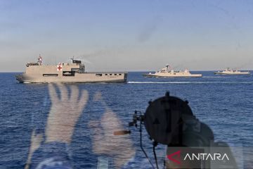 Refleksi dari KRI dr Soeharso 990 (kiri), KRI Raden Eddy Martadinata-331 (tengah) dan KRI Sultan Hasanuddin-366 (kanan) saat manuvra taktis dalam fase laut Multilateral Naval Exercise Komodo (MNEK) 2023 di Selat Makassar, Sulawesi Selatan, Kamis (8/6/2023). Dalam fase laut tersebut berlangsung latihan penyelamatan, operasi interdiksi maritim, manuvra taktis, bantuan kemanusiaan dan penanggulangan bencana alam, dan penghormatan terakhir kepada 17 kapal perang Angkatan Laut negara yang terlibat dalam MNEK 2023. ANTARA FOTO/M Risyal Hidayat/tom.
