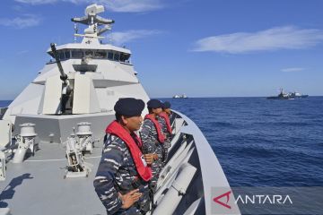 Sejumlah prajurit TNI AL awak KRI I Gusti Ngurah Rai-332 melakukan penghormatan lambung kiri saat manuvra taktis dalam fase laut Multilateral Naval Exercise Komodo (MNEK) 2023 di Selat Makassar, Sulawesi Selatan, Kamis (8/6/2023). Dalam fase laut tersebut berlangsung latihan penyelamatan, operasi interdiksi maritim, manuvra taktis, bantuan kemanusiaan dan penanggulangan bencana alam, dan penghormatan terakhir kepada 17 kapal perang Angkatan Laut negara yang terlibat dalam MNEK 2023. ANTARA FOTO/M Risyal Hidayat/tom.