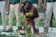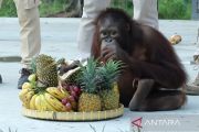 Orang utan Kalimantan (Pongo Pygmaeus) bernama Nadia memakan buah-buahan yang diberikan petugas saat pertunjukan satwa di Solo Safari, Kota Solo, Jawa Tengah, Jumat (9/6/2023). Kegiatan tersebut digelar untuk merayakan HUT ke-6 orang utan Nadia koleksi Solo Safari. ANTARAFOTO/Maulana Surya/nym.