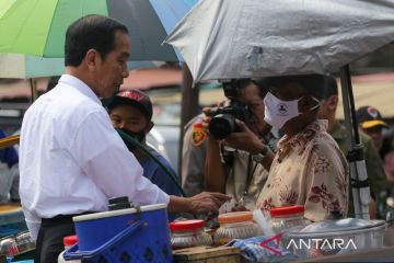 Presiden Joko Widodo (kiri) berbincang dengan pedagang kaki lima saat berkunjung ke Pasar Menteng Pulo, Jakarta, Kamis (15/6/2023). Presiden memantau harga bahan pokok di pasar tersebut untuk melihat potensi pergerakan inflasi dalam beberapa waktu ke depan dan membagikan paket sembako kepada masyarakat. ANTARA FOTO/Fauzan/tom.