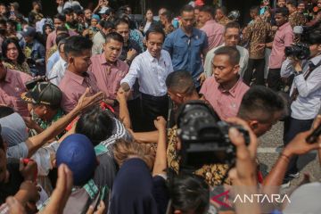 Presiden Joko Widodo (tengah) menyapa warga saat berkunjung ke Pasar Menteng Pulo, Jakarta, Kamis (15/6/2023). Presiden memantau harga bahan pokok di pasar tersebut untuk melihat potensi pergerakan inflasi dalam beberapa waktu ke depan dan membagikan paket sembako kepada masyarakat. ANTARA FOTO/Fauzan/tom.