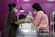 Dua warga memasangkan baju ke dua ekor anjing peliharaan yang telah disuntik vaksin rabies di Klinik Hewan Purnama di Pontianak, Kalimantan Barat, Sabtu (17/6/2023). Pemberian vaksin rabies pada hewan peliharaan tersebut bertujuan untuk mengantisipasi mewabahnya penyakit rabies, karena berdasarkan data Dinkes Provinsi Kalimantan Barat bahwa terhitung sejak Januari hingga 7 Juni 2023 telah terdapat 1.775 kasus gigitan di daerah setempat. ANTARA FOTO/Jessica Helena Wuysang/pras.