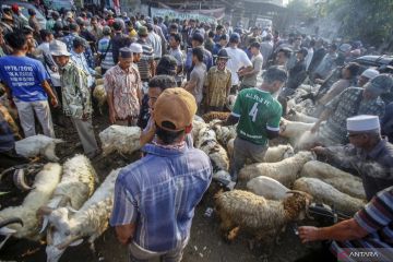 Pedagang menjajakan hewan untuk kurban di Pasar Hewan Jonggol, Kabupaten Bogor, Jawa Barat, Kamis (22/6/2023). Menurut pengelola, sepekan menjelang Hari Raya Idul Adha pasar hewan di Jonggol kian ramai pedagang dan pembeli dengan sekitar 900 ekor sapi dan 700 ekor kambing dan domba dari berbagai jenis dijajakan di pasar hewan tersebut. ANTARA FOTO/Yulius Satria Wijaya/hp.