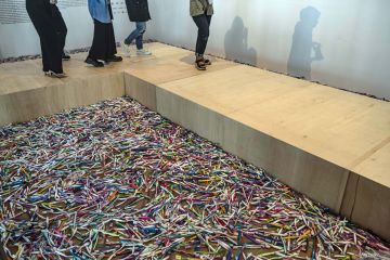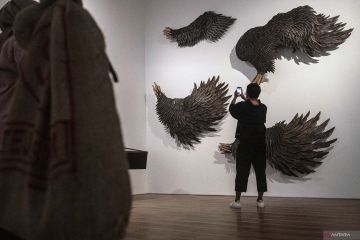 Jurnalis berjalan di dekat karya instalasi seni dalam pameran pasangan perupa Isabel dan Alfredo Aquilizan bertajuk Somewhere, Elsewhere, Nowhere saat preview media di Museum MACAN, Jakarta, Kamis (22/6/2023). Pameran yang mulai dibuka untuk publik pada 24 Juni-8 Oktober 2023 itu menampilkan karya-karya instalasi berskala besar dan seni gambar dari praktik kolaboratif pasangan perupa tersebut dalam rentang waktu 20 tahun lebih. ANTARA FOTO/Aprillio Akbar/hp.
