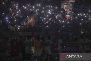 Suporter menyalakan 'flash light' karena stadion mati lampu saat pertandingan persahabatan Persija Jakarta menjamu Ratchaburi FC di Stadion Patriot Candrabhaga, Bekasi, Jawa Barat, Minggu (25/6/2023). ANTARA FOTO/Galih Pradipta/rwa.