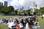 Sejumlah Warga Negara Indonesia mengikuti Shalat Idul Adha di Indian Recreation Club, Hong Kong, Kamis (29/6/2023). KJRI Hong Kong menggelar Shalat Idul Adha 1444 H bersama warga dan diaspora Indonesia di Hong Kong. ANTARA FOTO/Puspa Perwitasari/aww.