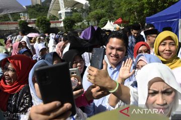 Menteri BUMN Erick Thohir melayani permintaan swafoto bersama Warga Negara Indonesia usai melaksanakan shalat Idul Adha di Indian Recreation Club, Hong Kong, Kamis (29/6/2023). KJRI Hong Kong menggelar Shalat Idul Adha 1444 H bersama warga dan diaspora Indonesia di Hong Kong. ANTARA FOTO/Puspa Perwitasari/aww.