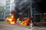 Sebuah kendaraan terbakar saat aksi protes atas terbunuhnya Nahel (17 tahun) saat pemeriksaan lalu lintas oleh polisi di Nanterre, Paris, Prancis, Kamis (29/6/2023). ANTARA FOTO/REUTERS/Sarah Meyssonnier/foc.