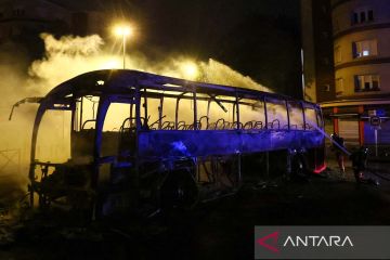 Seorang petugas pemadam kebakaran mencoba memadamkan api yang membakar bus saat kerusuhan berlanjut menyusul kematian seorang remaja berusia 17 tahun yang dibunuh oleh seorang petugas polisi Prancis saat pemberhentian lalu lintas, di Nanterre, pinggiran Paris, Prancis, (1/7/2023). Kerusuhan membara secara nasional di kota-kota Prancis, seperti Marseille, Lyon, Toulouse, Strasbourg, Lille dan Paris. ANTARA FOTO/REUTERS/Yves Herman/aww.