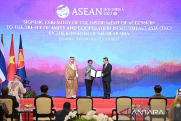 Menteri Luar Negeri Retno Marsudi (tengah) menyerahkan naskah Instrumen Aksesi Traktat Persahabatan dan Kerja sama Asia Tenggara (TAC) yang telah ditanda tangani Menlu Arab Saudi Faisal bin Farhan Al Saud (kiri) kepada Sekjen ASEAN Kao Kim Hourn (kanan) di Jakarta, Rabu (12/7/2023). Penandatanganan tersebut menandai pengakuan Arab Saudi pada prinsip-prinsip ASEAN yang mempromosikan perdamaian, persahabatan, dan kerja sama di Asia Tenggara. ANTARA FOTO/Muhammad Iqbal/tom.