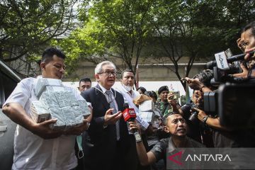 Pengacara terdakwa kasus dugaan korupsi base transceiver station (BTS) Irwan Hermawan, Maqdir Ismail (kiri) bersama timnya berjalan memasuki ruangan saat akan menjalani pemeriksaan di Gedung Bundar, Kejaksaan Agung, Jakarta, Kamis (13/7/2023). Maqdir Ismail menjalani pemeriksaan di Kejagung dengan membawa uang 1,8 juta dolar Amerika Serikat atau setara Rp26,9 miliar milik tersangka Irwan Hermawan untuk diserahkan terkait kasus dugaan korupsi penyediaan menara base transceiver station (BTS) 4G dan infrastruktur pendukung 1, 2, 3, 4, 5 Bakti Kementerian Komunikasi dan Informatika (Kemenkominfo). ANTARA FOTO/Rivan Awal Lingga/nym.