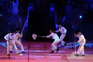 Sejumlah seniman menampilkan pergelaran opera in paradise saat pembukaan Festival Seni Bali Jani (FSBJ) V tahun 2023 di Taman Werdhi Budaya Art Centre, Denpasar, Bali, Minggu (16/7/2023). Kegiatan yang digelar pada 16-30 Juli 2023 tersebut mengusung tema Citta Rasmi Segara Kerthi, Bahari Sumber Inspirasi untuk memberikan ruang kreativitas kepada para penggiat seni modern Bali. ANTARA FOTO/Nyoman Hendra Wibowo/tom.