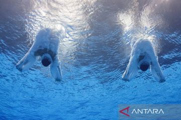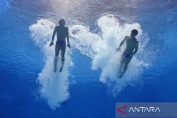 Atlet Indonesia Andriyan dan Adityo Restu Putra beraksi pada penyisihan loncatan 10m sinkron putra Kejuaraan Akuatik Dunia 2023 di Fukuoka Prefectural Pool, Fukuoka, Jepang, Senin (17/7/2023). ANTARA FOTO/REUTERS/Stefan Wermuth/tom.