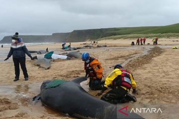 Sejumlah paus pilot mati terdampar di pantai Pulau Lewis, Skotlandia, Minggu (16/7/2023) waktu setempat. Fenomena paus terdampar massal tersebut merupakan terbanyak di negara itu dalam beberapa dekade dan petugas penyelamat beserta peneliti akan melakukan pengambilan sampel sekaligus nekropsi untuk mengetahui penyebab kematian 55 ekor paus pilot itu. ANTARA FOTO/Cristina McAvoy via Reuters/nym.