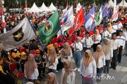 Peserta kirab membawa bendera partai peserta pemilu saat pembukaan Kirab Pemilu 2024 di Makassar, Sulawesi Selatan, Kamis (20/7/2023). Kirab Pemilu yang digelar hingga 26 Juli mendatang itu untuk menyosialisasikan penyelenggaraan Pemilu 2024 kepada masyarakat. ANTARA FOTO/Arnas Padda/Spt.