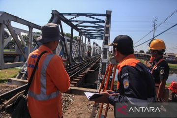 Sejumlah petugas mengecek kerusakan jalur kereta api pascakecelakaan truk berat tertabrak kereta api di perlintasan Madukoro Raya, Semarang, Jawa Tengah, Jumat (21/7/2023). Dirjen Kementerian Perhubungan menghimbau Pemda setempat memasang rambu larangan kendaraan berat terutama truk trailer berlantai rendah (lowdeck) melewati perlintasan itu, karena peristiwa kecelakaan KA tabrak truk di lokasi tersebut sudah terjadi tiga kali. ANTARA FOTO/Makna Zaezar/rwa.