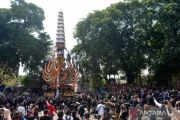 Ribuan warga mengarak bade atau menara usungan jenazah mantan Bupati Gianyar periode 1993-2003 Tjokorda Gde Budi Suryawan saat upacara Pelebon atau Ngaben di Ubud, Gianyar, Bali, Senin (24/7/2023). Upacara kremasi tersebut disaksikan oleh ribuan warga dan wisatawan di kawasan pariwisata Ubud. ANTARA FOTO/Fikri Yusuf/nym.