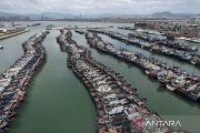 Foto udara kapal-kapal nelayan berlindung di sebuah pelabuhan di Xiamen, Provinsi Fujian, China tenggara, Rabu (26/7/2023). Kantor Pusat Pengendalian Banjir dan Bantuan Kekeringan Negara China pada Rabu (26/7) menaikkan level tanggap darurat untuk topan dan banjir ke Level III saat Topan Doksuri diperkirakan akan mendarat di China selatan pada Jumat (28/7) dan mengerahkan empat tim ke Provinsi Zhejiang, Fujian, Guangdong, dan Jiangxi untuk membantu upaya-upaya pencegahan banjir dan topan setempat. ANTARA FOTO/Xinhua/Zeng Demeng/rwa.