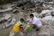 Tim SAR gabungan mengambil sampel air yang dipompa keluar dari lubang tempat delapan penambang emas terjebak di Desa Pancurendang, Ajibarang, Banyumas, Jawa Tengah, Selasa (1/8/2023). Petugas mengambil sampel air untuk melakukan pemeriksaan jenis dan jumlah bakteri yang mengkontaminasi sumber air di sekitar lokasi tambang. ANTARA FOTO/Idhad Zakaria/rwa.