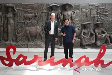 Ketua PSSI Erick Thohir (kiri) mengajak Konsultan Timnas Indonesia U-17 Frank Wormuth belanja batik di Sarinah, setelah tiba di Jakarta pada Selasa (1/8/2023). PSSI menunjuk mantan pelatih timnas Jerman U-20 itu sebagai konsultan Timnas Indonesia U-17 yang akan mendampingi pelatih Bima Sakti untuk memoles Timnas Garuda Asia untuk persiapan Piala Dunia U-17 2023 pada November-Desember mendatang. ANTARA/HO/PSSI/pras.