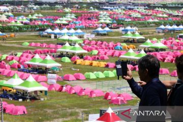 Seorang warga merekam lokasi perkemahan Jambore Pramuka Dunia ke-25 (25th World Scout Jamboree) di Buan, Korea Selatan, Kamis (4/8/2023). Jambore yang akan berlangsung hingga 12 Agustus 2023 itu dihadiri sekitar 43.000 pramuka dari 150 negara dan Indonesia mengirimkan kontingen pramukanya yang beranggotakan lebih dari 1.700 orang. ANTARA FOTO/REUTERS/Kim Hong-Ji/tom.