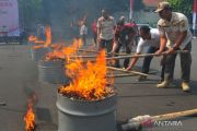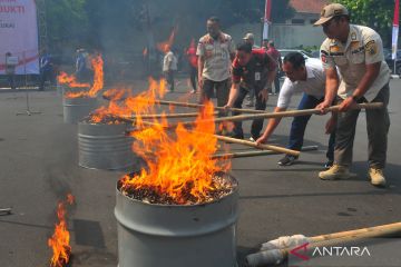 Petugas secara simbolis membakar rokok ilegal saat pemusnahan di pendopo kabupaten Kudus, Jawa Tengah, Jumat (4/8/2023). Bea cukai bersama pemerintah setempat memusnahkan sebanyak 6,16 juta batang rokok ilegal berbagai merek hasil penindakan periode Mei 2022 sampai Mei 2023, dengan perkiraan nilai barang Rp7 miliar dan potensi kerugian negara Rp4,7 miliar. ANTARA FOTO/Yusuf Nugroho/aww.