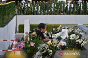 Seorang warga mempersembahkan bunga bagi para korban bom atom saat peringatan 78 tahun dijatuhkannya bom atom di Kota Hiroshima, di Taman Peace Memorial Park, Hiroshima, Jepang, Minggu (6/8/2023). ANTARA FOTO/Keita Iijima/The Yomiuri Shimbun via Reuters/tom.