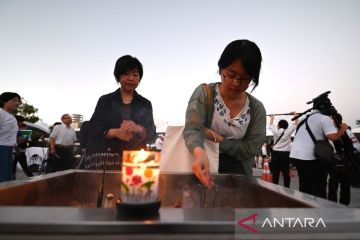 Warga berdoa bagi para korban bom atom saat peringatan 78 tahun dijatuhkannya bom atom di Kota Hiroshima, di Taman Peace Memorial Park, Hiroshima, Jepang, Minggu (6/8/2023). ANTARA FOTO/Keita Iijima/The Yomiuri Shimbun via Reuters/tom.