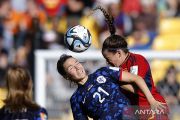 Pesepak bola putri Spanyol Teresa Abelleira (kanan) berebut menyundul bola dengan pemain Belanda Damaris Egurrola dalam laga perempat final Piala Dunia Wanita di Wellington Regional Stadium, Wellington, Selandia Baru, Jumat (11/8/2023). Spanyol menang 2-1 dan lolos ke semi final. ANTARA FOTO/REUTERS/Amanda Perobelli/foc.