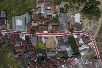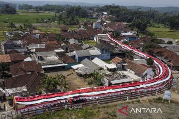 Foto udara lorong bendera Merah Putih yang terbentang di Desa Sukamenak, Kabupaten Tasikmalaya, Jawa Barat, Sabtu (12/8/2023). Lorong bendera Merah Putih bertema Terus Melaju untuk Indonesia Maju itu menghiasi jalan perkampungan sepanjang 250 meter yang dibuat warga secara swadaya guna memeriahkan HUT ke-78 Kemerdekaan RI. ANTARA FOTO/Adeng Bustomi/Spt.