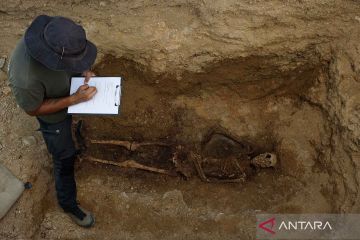 Antropolog Aranzadi Science Society Marga Rivas ikut ambil bagian dalam penggalian jenazah orang-orang yang dibunuh oleh pasukan diktator Francisco Franco tahun 1939 di pemakaman Colmenar Viejo, Spanyol, Jumat (11/8/2023). Penggalian terhadap lebih dari 100 jenazah korban perang saudara Spanyol tersebut untuk diidentifikasi dan diserahkan ke pihak keluarganya. ANTARA FOTO/Reuters/Juan Medina/nym.