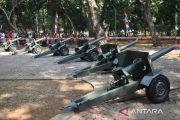 Meriam 75 mm disiapkan Batalyon Armed 7 untuk ditembakan saat upacara Peringatan Detik-Detik Proklamasi Kemerdekaan ke-78 Republik Indonesia di halaman Monas, Jakarta, Kamis (17/8/2023). HUT ke-78 RI mengusung tema Terus Melaju Untuk Indonesia Maju. ANTARA FOTO/Hafidz Mubarak A/aww.